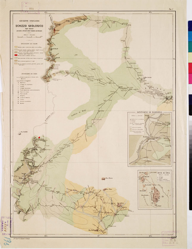"Studio Cartografico G. Giardi. Firenze. Sono gli itinerari seguiti e rilevati dai due viaggiatori dott. G. Stefanini e dott. G. Paoli ai quali il Governatore della Somalia, Sen. De Martino, affidava, alla fine del 1912, l'incarico di eseguire nella Somalia meridionale gli studi sulle condizioni idrologiche e sul problema minerario, contemporaneamente a studi di botanica e entomologia agraria. La Missione giungeva a Mogadiscio il 5 maggio 1913, diretta poi a Chisimaio e Giumbo da dove raggiungeva per terra, lungo il Giuba, Marghereb. Perveniva quindi, in battello, a Bardera. Venivano compiute escursioni fino a Egherta (2°5' lat. nord 43° 13' long. est) la spedizione raggiungeva in seguito Berdale e Iscia Baidoa. Altre visite venivano effettuate a Bur Acàba, alle colline granitiche di Bur Eibi e Uanle Uen da dove, con percorso del tutto nuovo, veniva raggiunto Mogadiscio. Gli itinerari perciò sono di un interesse particolare in quanto svoltisi in zone delle quali non esistevano rappresentazioni cartografiche attendibili e alcune delle quali non ancora visitate da bianchi. Rilevati alla bussola e disegnati alla scala di 1:100.000 essi furono poi riprodotti a scale minori e corredati della rappresentazione geologica. La tavola I è inoltre corredata di due rilevamenti parziali dei dintorni di Bardera (1:100.000) e di Bur Acàba (1:30.000) la tavola II contiene quattro spaccati (scala delle altezze 1:50.000)."