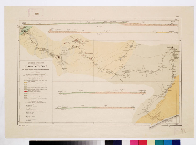 "Studio Cartografico G. Giardi. Firenze. Sono gli itinerari seguiti e rilevati dai due viaggiatori dott. G. Stefanini e dott. G. Paoli ai quali il Governatore della Somalia, Sen. De Martino, affidava, alla fine del 1912, l'incarico di eseguire nella Somalia meridionale gli studi sulle condizioni idrologiche e sul problema minerario, contemporaneamente a studi di botanica e entomologia agraria. La Missione giungeva a Mogadiscio il 5 maggio 1913, diretta poi a Chisimaio e Giumbo da dove raggiungeva per terra, lungo il Giuba, Marghereb. Perveniva quindi, in battello, a Bardera. Venivano compiute escursioni fino a Egherta (2°5' lat. nord 43° 13' long. est) la spedizione raggiungeva in seguito Berdale e Iscia Baidoa. Altre visite venivano effettuate a Bur Acàba, alle colline granitiche di Bur Eibi e Uanle Uen da dove, con percorso del tutto nuovo, veniva raggiunto Mogadiscio. Gli itinerari perciò sono di un interesse particolare in quanto svoltisi in zone delle quali non esistevano rappresentazioni cartografiche attendibili e alcune delle quali non ancora visitate da bianchi. Rilevati alla bussola e disegnati alla scala di 1:100.000 essi furono poi riprodotti a scale minori e corredati della rappresentazione geologica. La tavola I è inoltre corredata di due rilevamenti parziali dei dintorni di Bardera (1:100.000) e di Bur Acàba (1:30.000) la tavola II contiene quattro spaccati (scala delle altezze 1:50.000)."