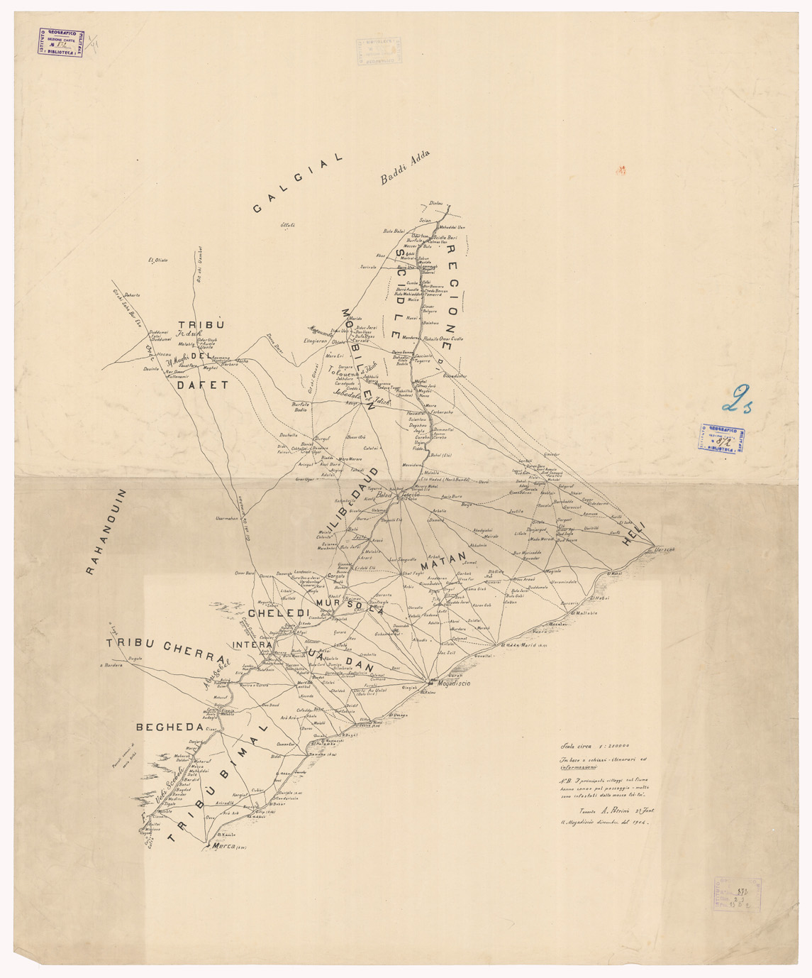 "Una planimetria fondata su schizzi, itinerari e informazioni, compilata dal Ten. A. Petrini. Stampa in nero, in foglio unico. Reca indicati i nomi delle tribù."