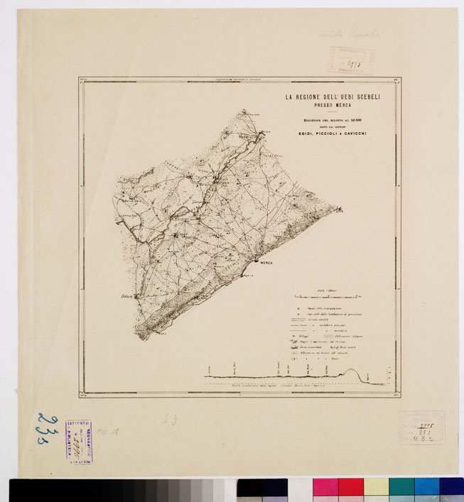 "I.G.M. Lavori di campagna eseguiti dal settembre 1911 al marzo 1912 dalla Missione Topografica dell'I.G.M. composta dal Cap. Egidi, Cap. Piccioli, e Cap. Cavicchi, dietro incarico del Governo della Somalia Italiana. Il rilevamento venne eseguito alla scala di 1:50.000 con la tavoletta pretoriana. Esso copre 800 Kmq. e si estende oltre Munghia e El Adaddei, rispettivamente a sud-ovest e nord-est da Merca, sulla costa, e verso l'interno oltre Mobarech. La carta è in un sol foglio stampata in nero con curve di livello tracciate all'equidistanza di 10 m. Le strade sono distinte in regolari percorribili da automobili, irregolari percorribili da carri leggeri, carovaniere, comunicazioni secondarie v'è poi indicato: moschee, stazioni radiotelegrafiche, capanne e villaggi irregolari, villaggi regolari di capanne, pozzi termitai, i vecchi alvei dei fiumi, le bassure ove stagnano le acque. Sulla costa sono mostrati gli ancoraggi e la linea della scogliera subacquea. Sono infine mostrate le coltivazioni indigene, le praterie, i vari tipi di vegetazione boschiva le dune sono distinte in consolidate e mobili. Le longitudini sono riferite al meridiano di Greenwich. Di questa carta venne eseguita una riduzione al 200.000 (v. sotto lo stesso numero d'inventario)"