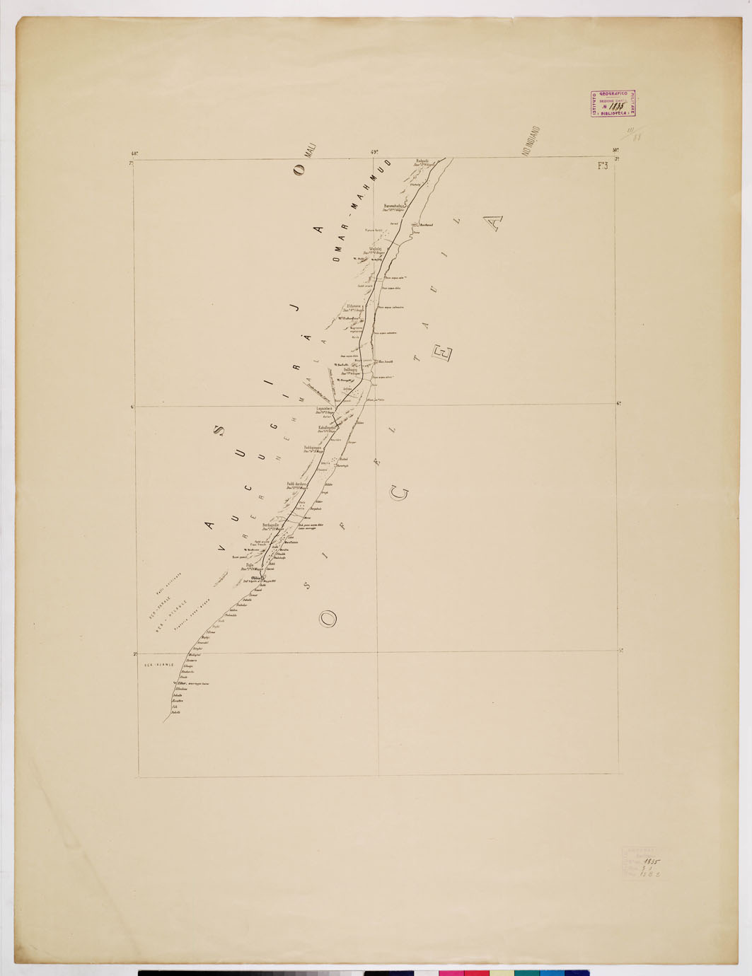 "I.G.M. Tre fogli originali montati su cartone. Rappresentano 1'itinerario seguito dal viaggiatore Robecchi-Brichetti nella Somalia Italiana, dal 28 maggio all'11agosto 1890, con l'appoggio del Governo, della Società Geografica Italiana e della Società Africana d'Italia. Il viaggio comportò circa 1.000 km. di percorso i dati raccolti dal viaggiatore contribuirono grandemente alla ulteriore conoscenza di quella Colonia. La carta fu compilata e disegnata dal top. Marchegiani. Essa fu pubblicata a colori alla scala di 1:1.000.000 dalla Società Geografica Italiana (Boll. Soc. Geogr., 1891) per cura di G. Dalla Vedova."
