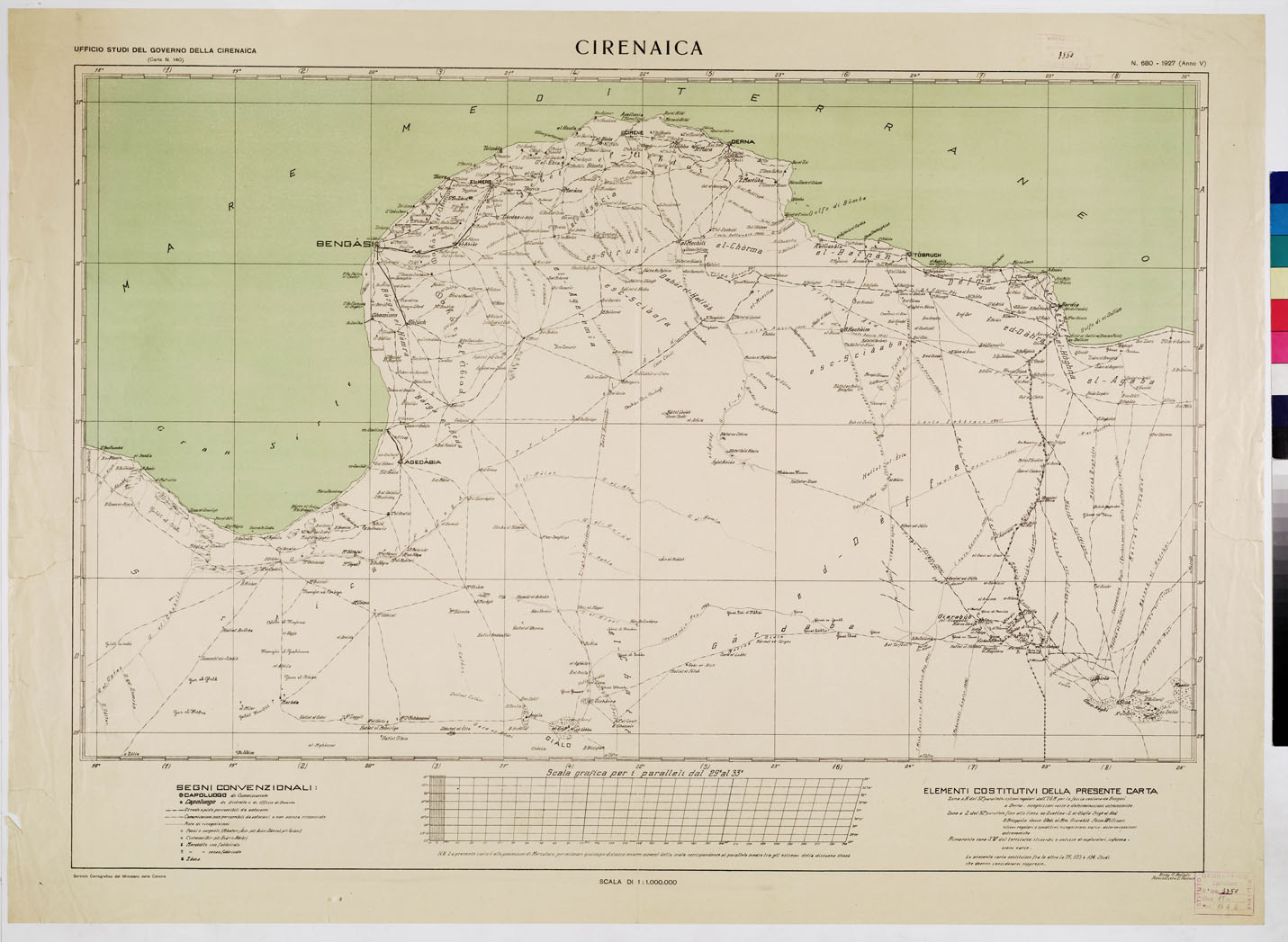 "Governo della Cirenaica. Ufficio Studi. La carta è fondata su tutto il materiale disponibile a tutto il 1925 comprendendo rilievi regolari dell'I.G.M. rilievi speditivi, ricognizioni, notizie di esploratori ed informazioni. Essa abbraccia tutto il territorio compreso fra 33° 10' e 28° 50' di lat. e 17° 50' e 26° 10' di long. est e fu pubblicata in sostituzione di tutte le carte precedenti. Stampata a colori essa è costruita su proiezione di Mercatore avendosi voluto tenere speciale conto delle necessità dell'aeronautica cui la carta è particolarmente destinata."