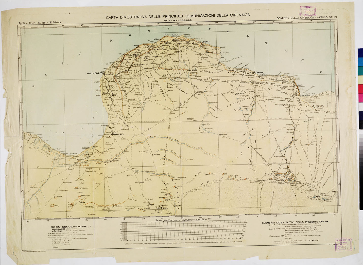 "Governo della Cirenaica. Ufficio Studi. La carta è fondata su tutto il materiale disponibile a tutto il 1925 comprendendo rilievi regolari dell'I.G.M. rilievi speditivi, ricognizioni, notizie di esploratori ed informazioni. Essa abbraccia tutto il territorio compreso fra 33° 10' e 28° 50' di lat. e 17° 50' e 26° 10' di long. est e fu pubblicata in sostituzione di tutte le carte precedenti. Stampata a colori essa è costruita su proiezione di Mercatore avendosi voluto tenere speciale conto delle necessità dell'aeronautica cui la carta è particolarmente destinata. "