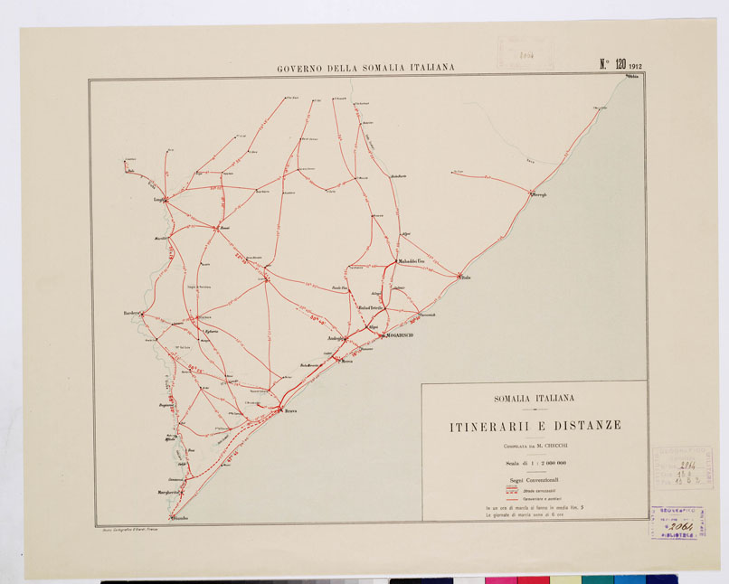 "Governo della Somalia Italiana. Studio Cartografico G. Giardi. Firenze. Un foglio che comprende la rete stradale della Somalia meridionale, da Giumbo e Itala, sulla costa, ai confini dell'interno. La rete è tracciata in rosso con distinzione delle strade carrozzabili (costruite e in costruzione), le carovaniere, i sentieri. Le distanze sono calcolate in ore di marcia. Il foglio fu inserito nella relazione del Sen. Nob. Giacomo De Martino " La Somalia Italiana nei tre anni del mio Governo", Roma, 1912. (Carlo Colombo, Tipografia della Camera dei Deputati)."