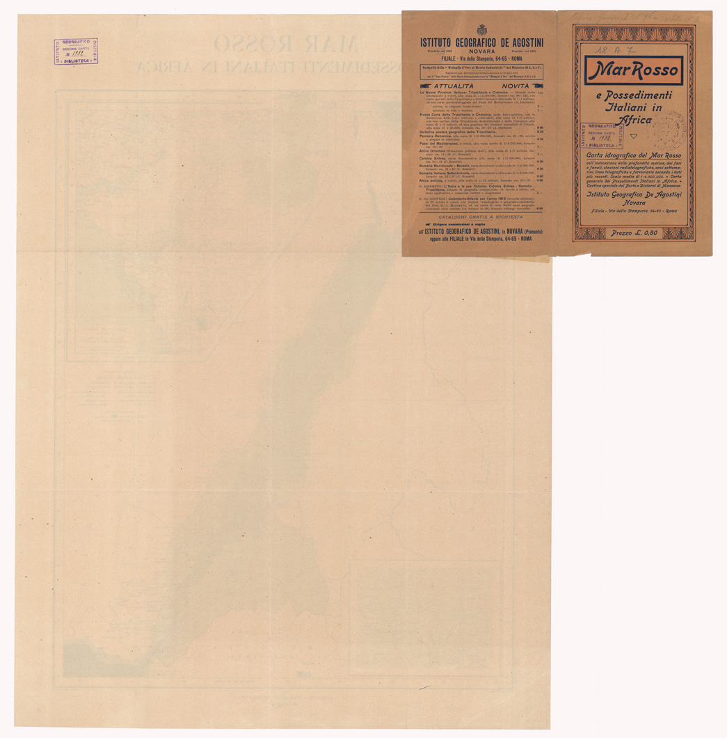 "Carta idrografica del Mar Rosso costruita su proiezione di Mercatore, con l'indicazione delle profondità marine, fari, fanali, stazioni radiotelegrafiche, cavi sottomarini, linee telegrafiche e ferroviarie, in base ai dati più recenti all'epoca della pubblicazione.SCALA EQUATORIALE 1:4.700.000 Il foglio è piegato e contenuto in libretto e contiene una cartina generale dei possedimenti italiani in Africa alla scala di 1:24.000.000 e una cartina speciale del Porto di Massaua e dintorni alla scala di 1:75.000."