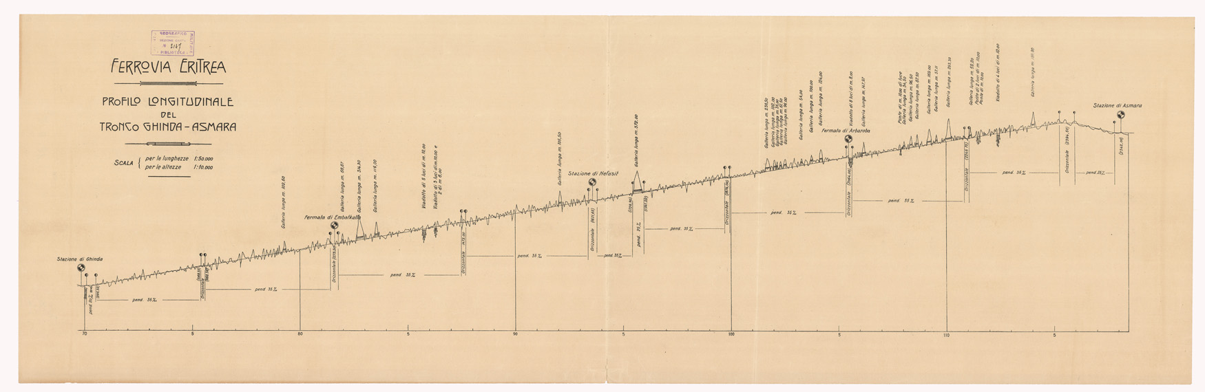 "MINISTERO DELLE COLONIE. SERVIZIO CARTOGRAFICO, 1911-1914. Due profili longitudinali per tronchi Taulud (Massaua)-Ghinda e Ghinda-Asmara, alla scala di 1:50.000 per le lunghezze e 1:10.000 per le altezze. Una terza tavola presenta la planimetria della linea alla scala di 1:100.000. Le tavole furono accompagnate da un testo illustrativo e da numerose belle fotografie (Stab. Danesi. Roma 1911) riunite in un album."