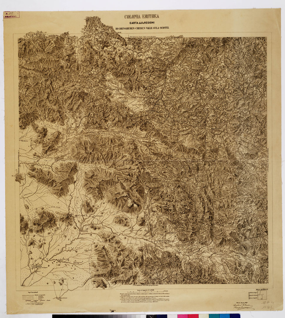 "I.G.M.Due fogli riproduzione delle levate originali eseguite nel 1891-92 dal Cap. Severi e dal Ten. Sapelli. Il terreno è rappresentato con molta evidenza mediante il tratteggio a luce zenitale. Parte di questo rilievo servi per il foglio Sciotel della carta al 50.000 della Colonia Eritrea (ved. N° 61 d'ordine, N. 724 d'inventario). Delle tavolette furono eseguite anche riduzioni al 75.000 e al 100.000."