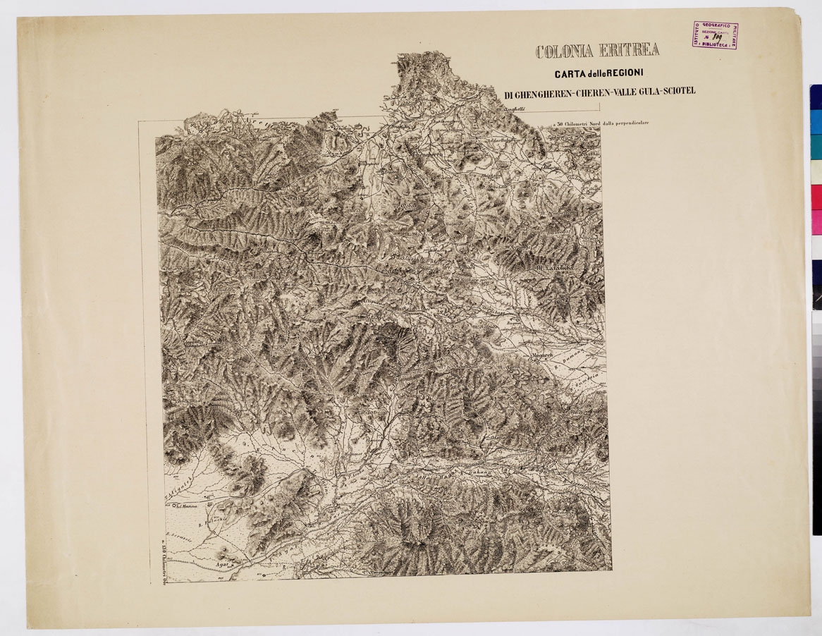 "I.G.M.Due fogli riproduzione delle levate originali eseguite nel 1891-92 dal Cap. Severi e dal Ten. Sapelli. Il terreno è rappresentato con molta evidenza mediante il tratteggio a luce zenitale. Parte di questo rilievo servi per il foglio Sciotel della carta al 50.000 della Colonia Eritrea (ved. N° 61 d'ordine, N. 724 d'inventario). Delle tavolette furono eseguite anche riduzioni al 75.000 e al 100.000."