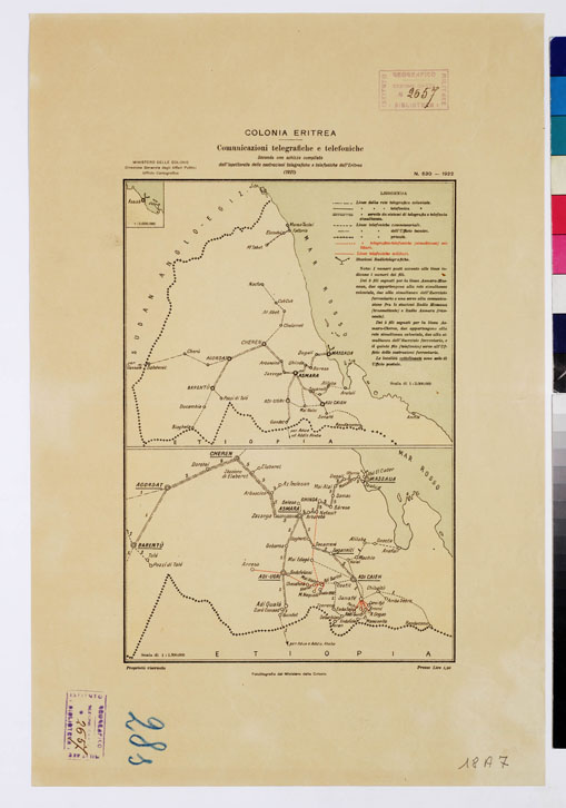 "Ministero delle Colonie. Direzione Generale degli Affari Politici. Ufficio Cartografico. Un foglio in fotolitografia a colori alla scala di 1:3.000.000 per 1'intera Colonia e di 1:1.500.000 per la zona Massaua, Cheren, Asmara, Adi Caieh, Barentù. Contiene una nota illustrativa intorno alla distribuzione e al funzionamento dei fili."