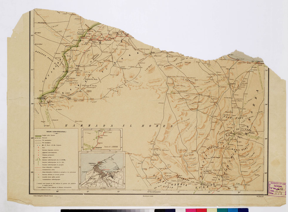 "(Comunicazioni elettriche ed ottiche. Uffici Postali). Ministero delle Colonie. Direzione Generale Affari Politici. Ufficio Cartografico. La stessa carta di cui al N° 26 d'ordine (N. 2132 d' inventario), mostrante, mediante numerosi segni convenzionali, la distribuzione del servizio telegrafico e radiotelegrafico. Tre cartine speciali per Tripoli e le linee Murzuch-Um el Abid e Casr Zafran (Sirte)-Nufilia sono alle scale rispettive di 1:50.000 e 1:500.000."