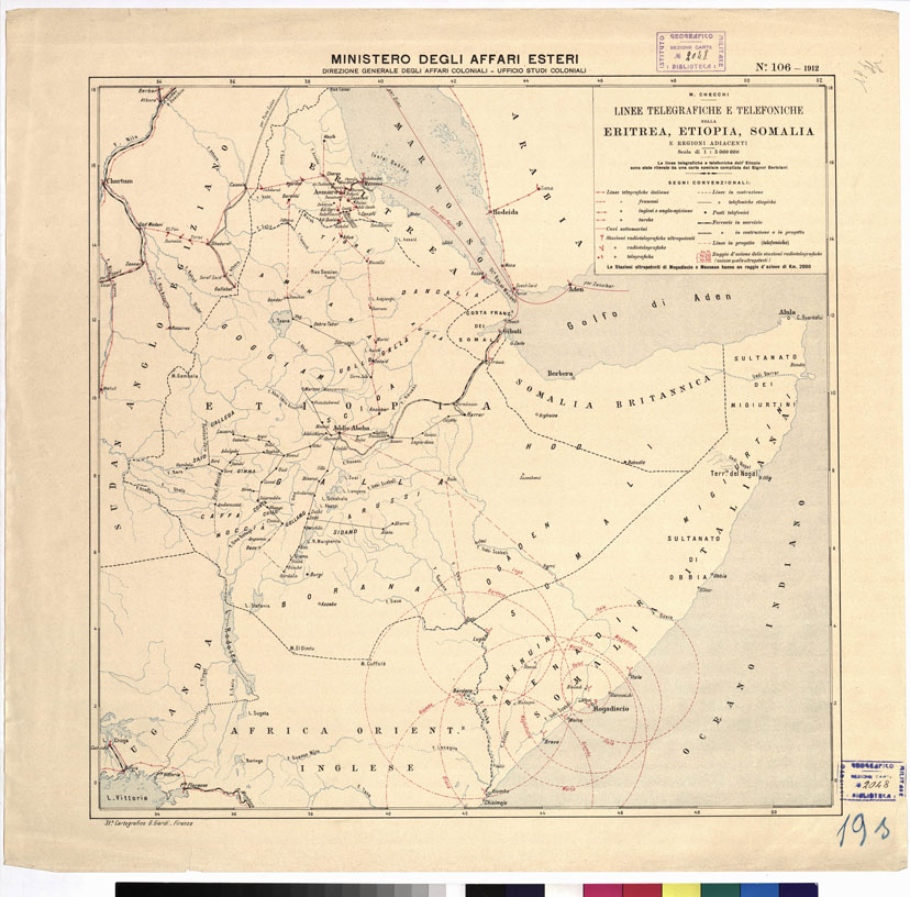 "A CURA DEL MINISTERO DEGLI AFFARI ESTERI. DIREZIONE GENERALE DEGLI AFFARI COLONIALI. UFFICIO STUDI COLONIALI. STUDIO CARTOGRAFICO G. GIARDI (FI) Un foglio compilato da M. Checchi. Sono tracciate in rosso le linee telegrafiche italiane, francesi, inglesi, anglo-egiziane, turche, e i cavi sottomarini pure in rosso sono segnalate le stazioni radiotelegrafiche ultrapotenti le radiotelegrafiche e le telegrafiche. Per le linee in costruzione, le telegrafiche etiopiche, ferrovie (in esercizio, in costruzione o in progetto) e i posti telefonici si sono adottati segni in nero. Le linee telegrafiche e telefoniche dell'Etiopia furono tratte da una carta speciale compilata da Bertolani."