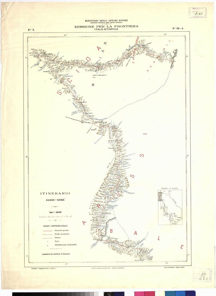 "(Ministero degli Affari Esteri. Direzione Centrale degli Affari Coloniali). I.G.M. Rappresentazione degli itinerari, seguiti dalla Missione inviata in Colonia per il tracciamento dei confini tra la Somalia e l'Abissinia. La Missione (Cap. Citerni, E. Grupelli e A. Venturi, topografi dell'I.G.M.) oltre il lavoro di tracciamento sul terreno del confine da Dolo all'Uebi Scebeli, compieva un rilievo regolare di Adis Abeba al 25.000, (vedere N° 67 d'ordine, N. 2039 d'inventario generale, Gruppo Eritrea) e rilevava poi 1'itinerario percorso attraverso la Somalia Italiana (Rovai, Egherta, Soblalle e Brava) per il ritorno in Patria. L'itinerario veniva accuratamente rilevato alla bussola servendosi della tavoletta Trinquier e veniva fissato sulle determinazioni astronomiche di Harrar, Adis Abeba, Dolo e Brava, e su altre numerose determinazioni di latitudine e longitudine. Per le altimetrie servirono le osservazioni termo-barometriche. I risultati topografici, originariamente alla scala di 1:100.000, furono suddivisi, nella riduzione al 500.000, in sei fogli comprendenti rispettivamente gli itinerari di: Arrar-Auasc, Auasc-Gobà, Gobà-Ganale, Dolo-Baidoa, Baidoa-Brava. La stampa è a colori con orografia in bistro, idrografia in azzurro, carovaniere e sentieri in nero, itinerari percorsi in rosso. Ciascun foglio contiene un quadro d'unione. Le longitudini furono riferite al meridiano di Greenwich. L'itinerario costituisce un prezioso contributo cartografico."