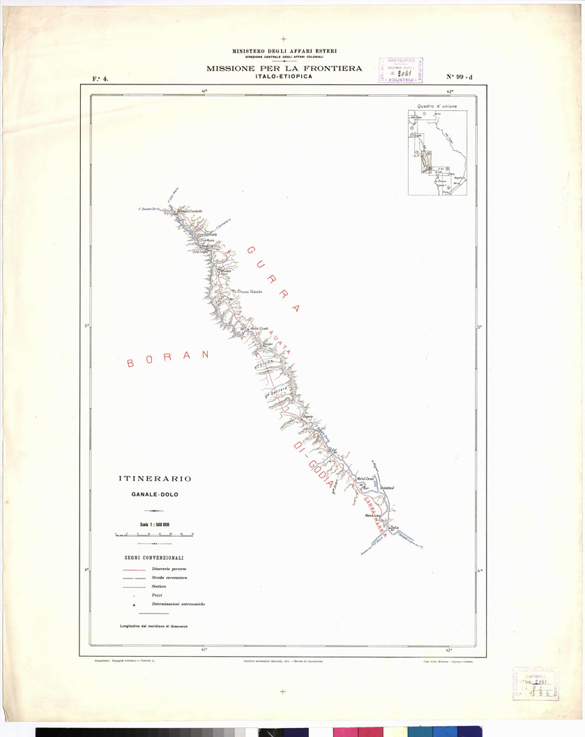 "(Ministero degli Affari Esteri. Direzione Centrale degli Affari Coloniali). I.G.M. Rappresentazione degli itinerari, seguiti dalla Missione inviata in Colonia per il tracciamento dei confini tra la Somalia e l'Abissinia. La Missione (Cap. Citerni, E. Grupelli e A. Venturi, topografi dell'I.G.M.) oltre il lavoro di tracciamento sul terreno del confine da Dolo all'Uebi Scebeli, compieva un rilievo regolare di Adis Abeba al 25.000, (vedere N° 67 d'ordine, N. 2039 d'inventario generale, Gruppo Eritrea) e rilevava poi 1'itinerario percorso attraverso la Somalia Italiana (Rovai, Egherta, Soblalle e Brava) per il ritorno in Patria. L'itinerario veniva accuratamente rilevato alla bussola servendosi della tavoletta Trinquier e veniva fissato sulle determinazioni astronomiche di Harrar, Adis Abeba, Dolo e Brava, e su altre numerose determinazioni di latitudine e longitudine. Per le altimetrie servirono le osservazioni termo-barometriche. I risultati topografici, originariamente alla scala di 1:100.000, furono suddivisi, nella riduzione al 500.000, in sei fogli comprendenti rispettivamente gli itinerari di: Arrar-Auasc, Auasc-Gobà, Gobà-Ganale, Dolo-Baidoa, Baidoa-Brava. La stampa è a colori con orografia in bistro, idrografia in azzurro, carovaniere e sentieri in nero, itinerari percorsi in rosso. Ciascun foglio contiene un quadro d'unione. Le longitudini furono riferite al meridiano di Greenwich. L'itinerario costituisce un prezioso contributo cartografico."