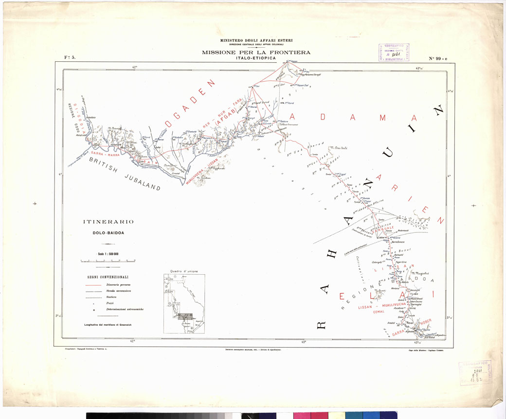 "(Ministero degli Affari Esteri. Direzione Centrale degli Affari Coloniali). I.G.M. Rappresentazione degli itinerari, seguiti dalla Missione inviata in Colonia per il tracciamento dei confini tra la Somalia e l'Abissinia. La Missione (Cap. Citerni, E. Grupelli e A. Venturi, topografi dell'I.G.M.) oltre il lavoro di tracciamento sul terreno del confine da Dolo all'Uebi Scebeli, compieva un rilievo regolare di Adis Abeba al 25.000, (vedere N° 67 d'ordine, N. 2039 d'inventario generale, Gruppo Eritrea) e rilevava poi 1'itinerario percorso attraverso la Somalia Italiana (Rovai, Egherta, Soblalle e Brava) per il ritorno in Patria. L'itinerario veniva accuratamente rilevato alla bussola servendosi della tavoletta Trinquier e veniva fissato sulle determinazioni astronomiche di Harrar, Adis Abeba, Dolo e Brava, e su altre numerose determinazioni di latitudine e longitudine. Per le altimetrie servirono le osservazioni termo-barometriche. I risultati topografici, originariamente alla scala di 1:100.000, furono suddivisi, nella riduzione al 500.000, in sei fogli comprendenti rispettivamente gli itinerari di: Arrar-Auasc, Auasc-Gobà, Gobà-Ganale, Dolo-Baidoa, Baidoa-Brava. La stampa è a colori con orografia in bistro, idrografia in azzurro, carovaniere e sentieri in nero, itinerari percorsi in rosso. Ciascun foglio contiene un quadro d'unione. Le longitudini furono riferite al meridiano di Greenwich. L'itinerario costituisce un prezioso contributo cartografico."