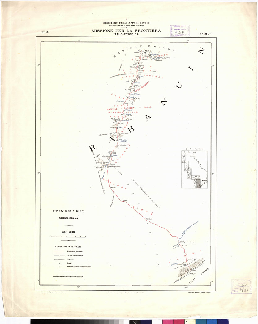 "(Ministero degli Affari Esteri. Direzione Centrale degli Affari Coloniali). I.G.M. Rappresentazione degli itinerari, seguiti dalla Missione inviata in Colonia per il tracciamento dei confini tra la Somalia e l'Abissinia. La Missione (Cap. Citerni, E. Grupelli e A. Venturi, topografi dell'I.G.M.) oltre il lavoro di tracciamento sul terreno del confine da Dolo all'Uebi Scebeli, compieva un rilievo regolare di Adis Abeba al 25.000, (vedere N° 67 d'ordine, N. 2039 d'inventario generale, Gruppo Eritrea) e rilevava poi 1'itinerario percorso attraverso la Somalia Italiana (Rovai, Egherta, Soblalle e Brava) per il ritorno in Patria. L'itinerario veniva accuratamente rilevato alla bussola servendosi della tavoletta Trinquier e veniva fissato sulle determinazioni astronomiche di Harrar, Adis Abeba, Dolo e Brava, e su altre numerose determinazioni di latitudine e longitudine. Per le altimetrie servirono le osservazioni termo-barometriche. I risultati topografici, originariamente alla scala di 1:100.000, furono suddivisi, nella riduzione al 500.000, in sei fogli comprendenti rispettivamente gli itinerari di: Arrar-Auasc, Auasc-Gobà, Gobà-Ganale, Dolo-Baidoa, Baidoa-Brava. La stampa è a colori con orografia in bistro, idrografia in azzurro, carovaniere e sentieri in nero, itinerari percorsi in rosso. Ciascun foglio contiene un quadro d'unione. Le longitudini furono riferite al meridiano di Greenwich. L'itinerario costituisce un prezioso contributo cartografico."