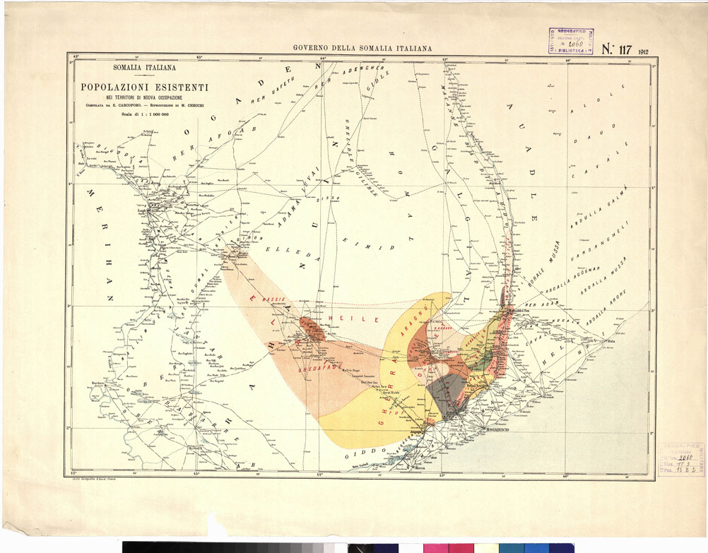 "Governo della Somalia Italiana. Studio Cartografico G. Giardi. Firenze. É la stessa carta di cui al N° 13 d'ordine (N. 2058 d'inventario), su la quale è stata riportata la distribuzione etnografica. Compilazione di E. Carcoforo. Riproduzione di M. Checchi. "