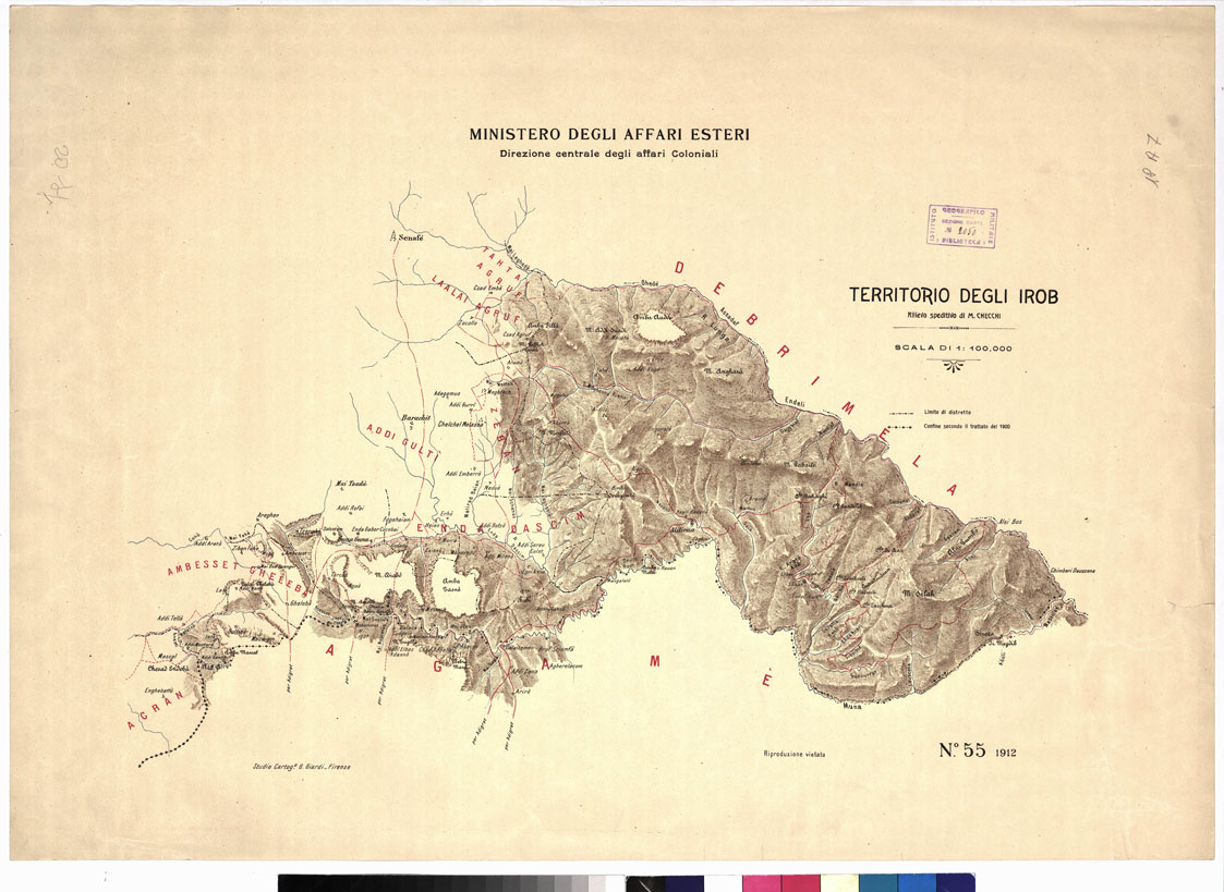 "Ministero degli Affari Esteri. Direzione Centrale degli Affari Coloniali. Studio Cartografico G. Giardi. Rilievo speditivo di M. Checchi riprodotto in cromo con orografia a tratteggio in bistro, rete fluviale in azzurro, rete stradale in rosso. Il rilievo si estende a tutto il territorio compreso entro il corso dell'Endeli e il confine secondo il trattato del 1900. "