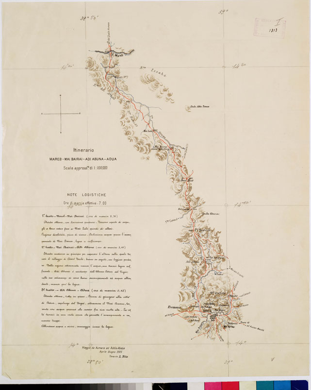 "I.G.M. Ventiquattro tratti dell'itinerario seguito dal Tenente Elia durante il viaggio Asmara-Addis Abeba (aprile-giugno 1906). I primi sette sono stati stampati a colori con orografia in bistro (tratteggio dimostrativo), acque in azzurro, tracciato dell'itinerario in rosso, scritture in nero. I rimanenti sono stampati in nero. Ogni tratto, è accompagnato dalle relative note logistiche. Le distanze sono calcolate in ore di marcia. Questi itinerari, insieme con altri rilievi speditivi, schizzi e itinerari inediti, furono adoperati per la compilazione dei fogli 9 e 10 della Carta dimostrativa della Colonia Eritrea e regioni adiacenti alla scala di 1:400.000 (ved. N° 41 d'ordine, N. 693 d'inventario generale)."