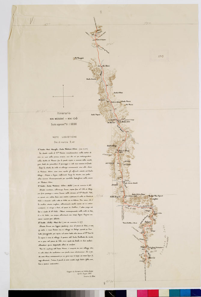 "I.G.M. Ventiquattro tratti dell'itinerario seguito dal Tenente Elia durante il viaggio Asmara-Addis Abeba (aprile-giugno 1906). I primi sette sono stati stampati a colori con orografia in bistro (tratteggio dimostrativo), acque in azzurro, tracciato dell'itinerario in rosso, scritture in nero. I rimanenti sono stampati in nero. Ogni tratto, è accompagnato dalle relative note logistiche. Le distanze sono calcolate in ore di marcia. Questi itinerari, insieme con altri rilievi speditivi, schizzi e itinerari inediti, furono adoperati per la compilazione dei fogli 9 e 10 della Carta dimostrativa della Colonia Eritrea e regioni adiacenti alla scala di 1:400.000 (ved. N° 41 d'ordine, N. 693 d'inventario generale)."
