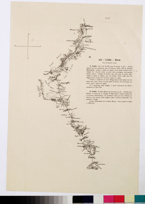 "I.G.M. Ventiquattro tratti dell'itinerario seguito dal Tenente Elia durante il viaggio Asmara-Addis Abeba (aprile-giugno 1906). I primi sette sono stati stampati a colori con orografia in bistro (tratteggio dimostrativo), acque in azzurro, tracciato dell'itinerario in rosso, scritture in nero. I rimanenti sono stampati in nero. Ogni tratto, è accompagnato dalle relative note logistiche. Le distanze sono calcolate in ore di marcia. Questi itinerari, insieme con altri rilievi speditivi, schizzi e itinerari inediti, furono adoperati per la compilazione dei fogli 9 e 10 della Carta dimostrativa della Colonia Eritrea e regioni adiacenti alla scala di 1:400.000 (ved. N° 41 d'ordine, N. 693 d'inventario generale)."