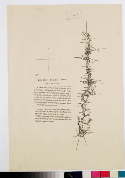 "I.G.M. Ventiquattro tratti dell'itinerario seguito dal Tenente Elia durante il viaggio Asmara-Addis Abeba (aprile-giugno 1906). I primi sette sono stati stampati a colori con orografia in bistro (tratteggio dimostrativo), acque in azzurro, tracciato dell'itinerario in rosso, scritture in nero. I rimanenti sono stampati in nero. Ogni tratto, è accompagnato dalle relative note logistiche. Le distanze sono calcolate in ore di marcia. Questi itinerari, insieme con altri rilievi speditivi, schizzi e itinerari inediti, furono adoperati per la compilazione dei fogli 9 e 10 della Carta dimostrativa della Colonia Eritrea e regioni adiacenti alla scala di 1:400.000 (ved. N° 41 d'ordine, N. 693 d'inventario generale)."