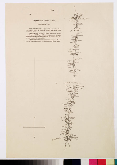 "I.G.M. Ventiquattro tratti dell'itinerario seguito dal Tenente Elia durante il viaggio Asmara-Addis Abeba (aprile-giugno 1906). I primi sette sono stati stampati a colori con orografia in bistro (tratteggio dimostrativo), acque in azzurro, tracciato dell'itinerario in rosso, scritture in nero. I rimanenti sono stampati in nero. Ogni tratto, è accompagnato dalle relative note logistiche. Le distanze sono calcolate in ore di marcia. Questi itinerari, insieme con altri rilievi speditivi, schizzi e itinerari inediti, furono adoperati per la compilazione dei fogli 9 e 10 della Carta dimostrativa della Colonia Eritrea e regioni adiacenti alla scala di 1:400.000 (ved. N° 41 d'ordine, N. 693 d'inventario generale)."