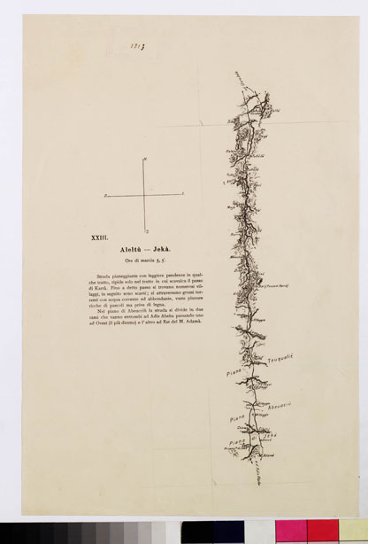 "I.G.M. Ventiquattro tratti dell'itinerario seguito dal Tenente Elia durante il viaggio Asmara-Addis Abeba (aprile-giugno 1906). I primi sette sono stati stampati a colori con orografia in bistro (tratteggio dimostrativo), acque in azzurro, tracciato dell'itinerario in rosso, scritture in nero. I rimanenti sono stampati in nero. Ogni tratto, è accompagnato dalle relative note logistiche. Le distanze sono calcolate in ore di marcia. Questi itinerari, insieme con altri rilievi speditivi, schizzi e itinerari inediti, furono adoperati per la compilazione dei fogli 9 e 10 della Carta dimostrativa della Colonia Eritrea e regioni adiacenti alla scala di 1:400.000 (ved. N° 41 d'ordine, N. 693 d'inventario generale)."