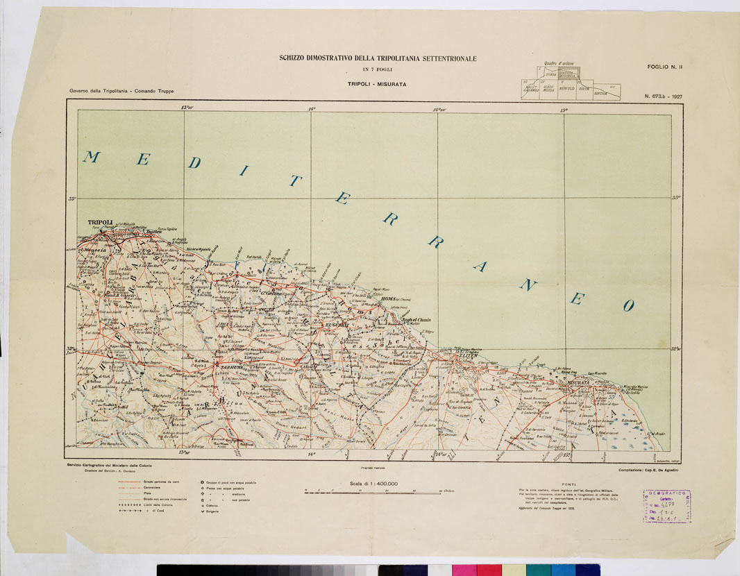 "Governo della Tripolitania. Servizio Cartografico del Ministero delle Colonie. La carta si compone di sette fogli estesi sulla costa alla zona compresa tra i confini della Tunisia e la Sirtica e nell'interno fino al 30° parallelo lat. nord. La carta è stampata a colori con orografia rappresentata dimostrativamente a curve di livello in bistro, idrografia in azzurro, rete stradale in rosso scritture e confini in nero. Particolarmente dimostrate sono le condizioni idrologiche della regione. Ogni foglio porta indicate le fonti sulle quali è basata la compilazione. in generale per la zona costiera veniva usufruito il rilievo regolare dell'I.G.M. e per il rimanente del territorio rilievi a vista e ricognizioni di ufficiali delle truppe indigene, itinerari di pattuglie dei R.R. Carabinieri e dello stesso compilatore (Cap. E. De Agostini). I titoli dei fogli sono: 1)Zuara 2) Tripoli Misurata 3) Nalùt Gadames 4) Giado Mizda 5) Béniulid 6) Sirte 7) Sirtica. Della carta esiste un'edizione più antica datata al 1915-1916 (v. N. 2220 d' inventario gen.) con annessa una carta della regione sirtica al 400.000 e l'elenco dei nomi di località."