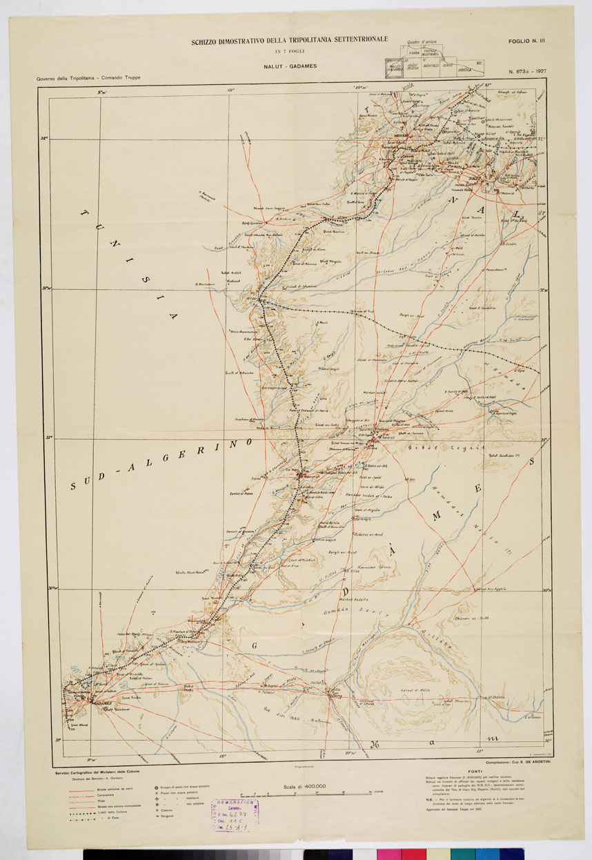 "Governo della Tripolitania. Servizio Cartografico del Ministero delle Colonie. La carta si compone di sette fogli estesi sulla costa alla zona compresa tra i confini della Tunisia e la Sirtica e nell'interno fino al 30° parallelo lat. nord. La carta è stampata a colori con orografia rappresentata dimostrativamente a curve di livello in bistro, idrografia in azzurro, rete stradale in rosso scritture e confini in nero. Particolarmente dimostrate sono le condizioni idrologiche della regione. Ogni foglio porta indicate le fonti sulle quali è basata la compilazione. in generale per la zona costiera veniva usufruito il rilievo regolare dell'I.G.M. e per il rimanente del territorio rilievi a vista e ricognizioni di ufficiali delle truppe indigene, itinerari di pattuglie dei R.R. Carabinieri e dello stesso compilatore (Cap. E. De Agostini). I titoli dei fogli sono: 1) Zuara 2) Tripoli Misurata 3) Nalùt Gadames 4) Giado Mizda 5) Béniulid 6) Sirte 7) Sirtica. Della carta esiste un'edizione più antica datata al 1915-1916 (v. N. 2220 d' inventario gen.) con annessa una carta della regione sirtica al 400.000 e l'elenco dei nomi di località."