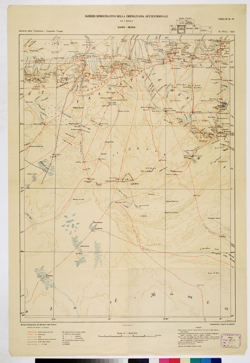 "Governo della Tripolitania. Servizio Cartografico del Ministero delle Colonie. La carta si compone di sette fogli estesi sulla costa alla zona compresa tra i confini della Tunisia e la Sirtica e nell'interno fino al 30° parallelo lat. nord. La carta è stampata a colori con orografia rappresentata dimostrativamente a curve di livello in bistro, idrografia in azzurro, rete stradale in rosso scritture e confini in nero. Particolarmente dimostrate sono le condizioni idrologiche della regione. Ogni foglio porta indicate le fonti sulle quali è basata la compilazione. in generale per la zona costiera veniva usufruito il rilievo regolare dell'I.G.M. e per il rimanente del territorio rilievi a vista e ricognizioni di ufficiali delle truppe indigene, itinerari di pattuglie dei R.R. Carabinieri e dello stesso compilatore (Cap. E. De Agostini). I titoli dei fogli sono: 1) Zuara 2) Tripoli Misurata 3) Nalùt Gadames 4) Giado Mizda 5) Béniulid 6) Sirte 7) Sirtica. Della carta esiste un'edizione più antica datata al 1915-1916 (v. N. 2220 d' inventario gen.) con annessa una carta della regione sirtica al 400.000 e l'elenco dei nomi di località."