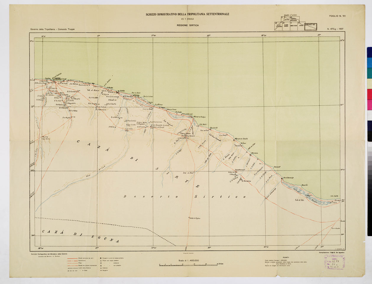 "Governo della Tripolitania. Servizio Cartografico del Ministero delle Colonie. La carta si compone di sette fogli estesi sulla costa alla zona compresa tra i confini della Tunisia e la Sirtica e nell'interno fino al 30° parallelo lat. nord. La carta è stampata a colori con orografia rappresentata dimostrativamente a curve di livello in bistro, idrografia in azzurro, rete stradale in rosso scritture e confini in nero. Particolarmente dimostrate sono le condizioni idrologiche della regione. Ogni foglio porta indicate le fonti sulle quali è basata la compilazione. in generale per la zona costiera veniva usufruito il rilievo regolare dell'I.G.M. e per il rimanente del territorio rilievi a vista e ricognizioni di ufficiali delle truppe indigene, itinerari di pattuglie dei R.R. Carabinieri e dello stesso compilatore (Cap. E. De Agostini). I titoli dei fogli sono: 1) Zuara 2) Tripoli Misurata 3) Nalùt Gadames 4) Giado Mizda 5) Béniulid 6) Sirte 7) Sirtica. Della carta esiste un'edizione più antica datata al 1915-1916 (v. N. 2220 d' inventario gen.) con annessa una carta della regione sirtica al 400.000 e l'elenco dei nomi di località."