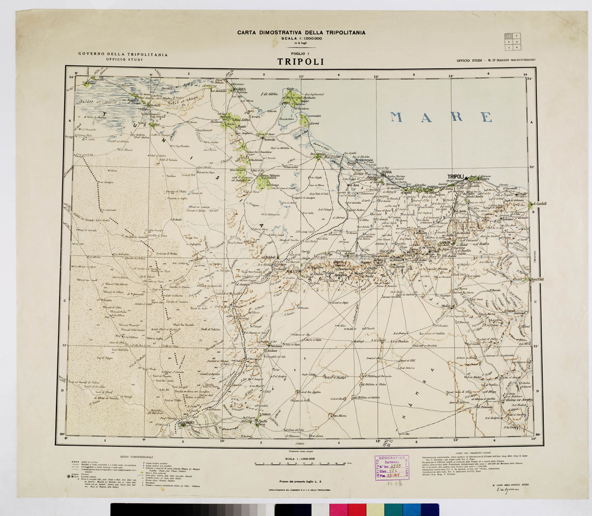 "COMANDO R. C. T. C. DELLA TRIPOLITANIA. UFFICIO GEO-TOPOGRAFICO. Carta in sei fogli riprodotta in fotocollografia su zinco dalla tipo-litografia del Comando R. C. T. C. della Tripolitania. Compilazione del Ten. V. Ghelardoni. Onomastica del Ten. G. Fatuzzo disegno del Serg. V. Clementi. I titoli dei fogli sono: 1) Tripoli 2) Misurata 3) Ubàri 4) Hon 5) Gat 6) Mùrzuch. La carta rappresenta il terreno a fondo unito giallino con dimostrazione orografica in bistro, acque in azzurro, rete stradale in rosso, rimanente in nero. Mostra ferrovie, strade (con manutenzione regolare, con adattamenti parziali, piste camionabili, carovaniere), confini, abitati, forti castelli, ruderi, marabutti, cimiteri, pozzi, ecc. Sono indicate le distanze chilometriche, le quote altimetriche e le profondità dei pozzi calcolate in metri. In basso, su ciascun foglio, trovasi la leggenda dei segni convenzionali e l'indicazione delle fonti impiegate per la compilazione. Al 1932 è stato pubblicato un aggiornamento da riportare al foglio 4° (Sébha o Hon) dietro determinazioni astronomiche e rilievi speditivi di ufficiali dell' I.G.M. "