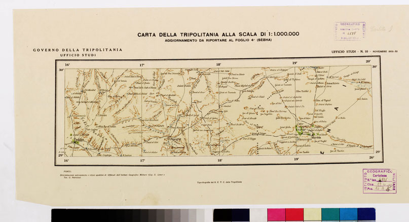 "COMANDO R. C. T. C. DELLA TRIPOLITANIA. UFFICIO GEO -TOPOGRAFICO. Carta in sei fogli riprodotta in fotocollografia su zinco dalla tipo-litografia del Comando R. C. T. C. della Tripolitania. Compilazione del Ten. V. Ghelardoni. Onomastica del Ten. G. Fatuzzo disegno del Serg. V. Clementi. I titoli dei fogli sono: 1) Tripoli 2) Misurata 3) Ubàri 4) Hon 5) Gat 6) Mùrzuch. La carta rappresenta il terreno a fondo unito giallino con dimostrazione orografica in bistro, acque in azzurro, rete stradale in rosso, rimanente in nero. Mostra ferrovie, strade (con manutenzione regolare, con adattamenti parziali, piste camionabili, carovaniere), confini, abitati, forti castelli, ruderi, marabutti, cimiteri, pozzi, ecc. Sono indicate le distanze chilometriche, le quote altimetriche e le profondità dei pozzi calcolate in metri. In basso, su ciascun foglio, trovasi la leggenda dei segni convenzionali e l'indicazione delle fonti impiegate per la compilazione. Al 1932 è stato pubblicato un aggiornamento da riportare al foglio 4° (Sébha o Hon) dietro determinazioni astronomiche e rilievi speditivi di ufficiali dell' I.G.M. "