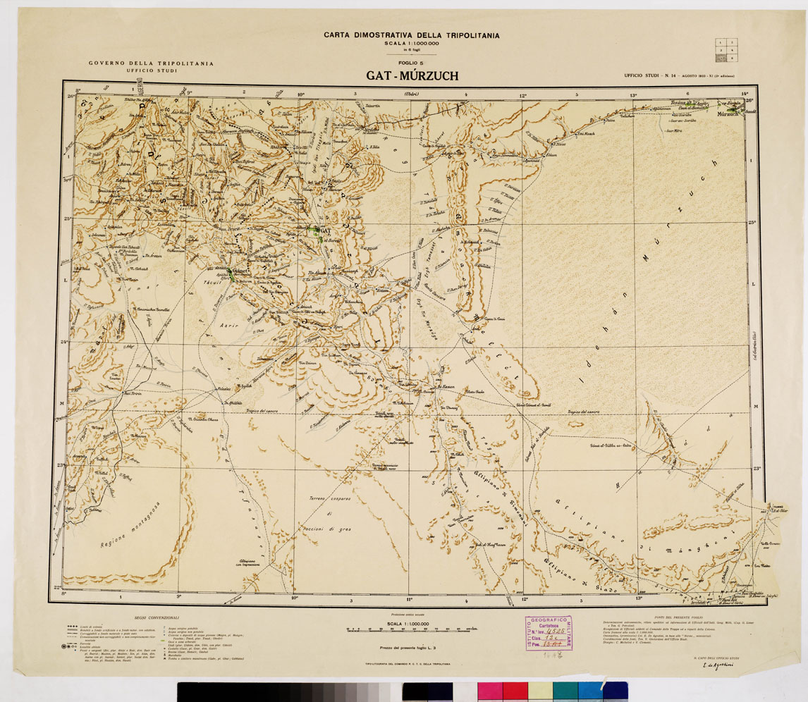 "COMANDO R. C. T. C. DELLA TRIPOLITANIA. UFFICIO GEO-TOPOGRAFICO. Carta in sei fogli riprodotta in fotocollografia su zinco dalla tipo-litografia del Comando R. C. T. C. della Tripolitania. Compilazione del Ten. V. Ghelardoni. Onomastica del Ten. G. Fatuzzo disegno del Serg. V. Clementi. I titoli dei fogli sono: 1) Tripoli 2) Misurata 3) Ubàri 4) Hon 5) Gat 6) Mùrzuch. La carta rappresenta il terreno a fondo unito giallino con dimostrazione orografica in bistro, acque in azzurro, rete stradale in rosso, rimanente in nero. Mostra ferrovie, strade (con manutenzione regolare, con adattamenti parziali, piste camionabili, carovaniere), confini, abitati, forti castelli, ruderi, marabutti, cimiteri, pozzi, ecc. Sono indicate le distanze chilometriche, le quote altimetriche e le profondità dei pozzi calcolate in metri. In basso, su ciascun foglio, trovasi la leggenda dei segni convenzionali e l'indicazione delle fonti impiegate per la compilazione. Al 1932 è stato pubblicato un aggiornamento da riportare al foglio 4° (Sébha o Hon) dietro determinazioni astronomiche e rilievi speditivi di ufficiali dell' I.G.M. "