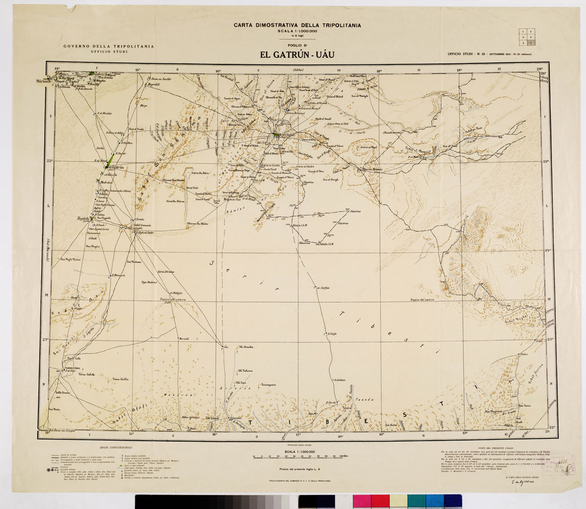 "COMANDO R. C. T. C. DELLA TRIPOLITANIA. UFFICIO GEO-TOPOGRAFICO. Carta in sei fogli riprodotta in fotocollografia su zinco dalla tipo-litografia del Comando R. C. T. C. della Tripolitania. Compilazione del Ten. V. Ghelardoni. Onomastica del Ten. G. Fatuzzo disegno del Serg. V. Clementi. I titoli dei fogli sono: 1) Tripoli 2) Misurata 3) Ubàri 4) Hon 5) Gat 6) Mùrzuch. La carta rappresenta il terreno a fondo unito giallino con dimostrazione orografica in bistro, acque in azzurro, rete stradale in rosso, rimanente in nero. Mostra ferrovie, strade (con manutenzione regolare, con adattamenti parziali, piste camionabili, carovaniere), confini, abitati, forti castelli, ruderi, marabutti, cimiteri, pozzi, ecc. Sono indicate le distanze chilometriche, le quote altimetriche e le profondità dei pozzi calcolate in metri. In basso, su ciascun foglio, trovasi la leggenda dei segni convenzionali e l'indicazione delle fonti impiegate per la compilazione. Al 1932 è stato pubblicato un aggiornamento da riportare al foglio 4° (Sébha o Hon) dietro determinazioni astronomiche e rilievi speditivi di ufficiali dell' I.G.M. "