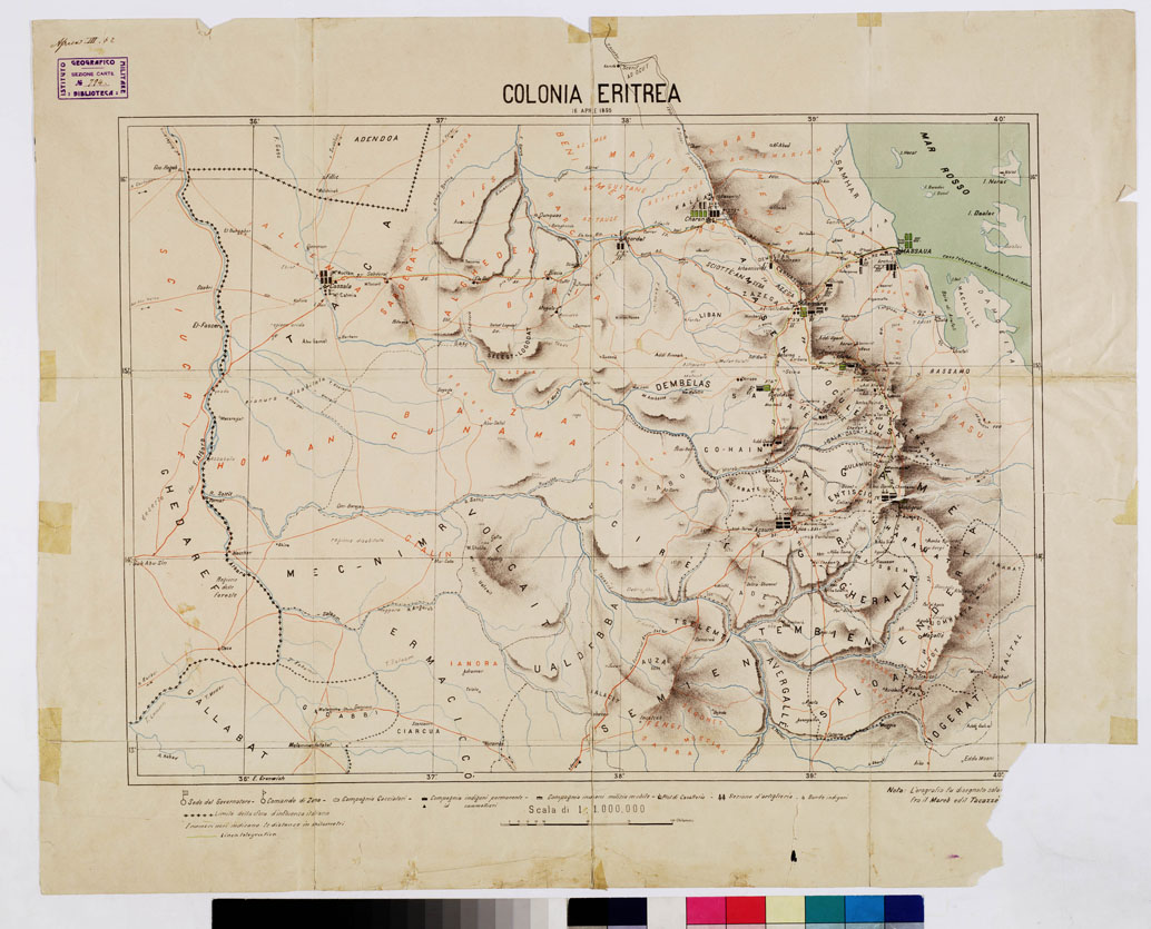 "Un foglio esteso al territorio compreso oltre i paralleli 13° e 16° e i meridiani 30° e 40°, con la dimostrazione della dislocazione delle truppe al 16 aprile 1895. Stampa a colori con orografia a sfumo limitata all'area fra il Mareb e il Tacazzé. Le longitudini sono riferite al meridiano di Greenwich. "