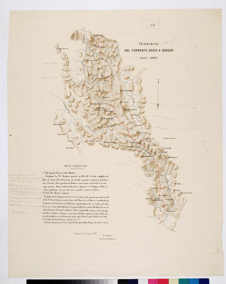 "I.G.M. ITINERARI OLTRE IL SETIT Sono 10 itinerari coi titoli rispettivi di: 1) El-Eghin-Nogara e Alcadrà- trivio Amba Mahar 2) Foce Sittona-Colle Chencher 3) Colle Chencher -Fiume Casà 4) Fiume Casà-Fiume Angareb 5)Fiume Angareb-Torrente Devez 6) Torrente Devez-Gondar 7) Gondar-Lago-Tzana 8) Tacazzé (Foce ittonia)-Culità-Adi Remoz e Culità-Belamba-Cafta 9) Adi Remoz-Adi Cocob-F.Casà-Torat-Mai Dembecà 10) Mai Dembecà-Bosa-Debarech-Encetcab-Darasghi. Stampa a colori con orografia rappresentata dimostrativamente in colore bistro, tracciato dell'itinerario in rosso, acque in azzurro, scritture in nero. In alcuni itinerari sono indicate le distanze calcolate in ore di marcia. Vi sono varie note logistiche. Vi è unito un quadro d'unione alla scala di 1:800.000. Gli itinerari furono rilevati dal Tenente Talamonti (1904) del R. Corpo di Truppe Coloniali e dalTenente Balugani del 4° Indigeni (1904-1905) e furono adoperati, insieme ai molti altri documenti del genere, per la compilazione della Carta dimostrativa della Colonia Eritrea e regioni adiacenti alla scala di 1:100.000. (ved. N° 41 d'ordine, N. 693 d'inventario generale)."