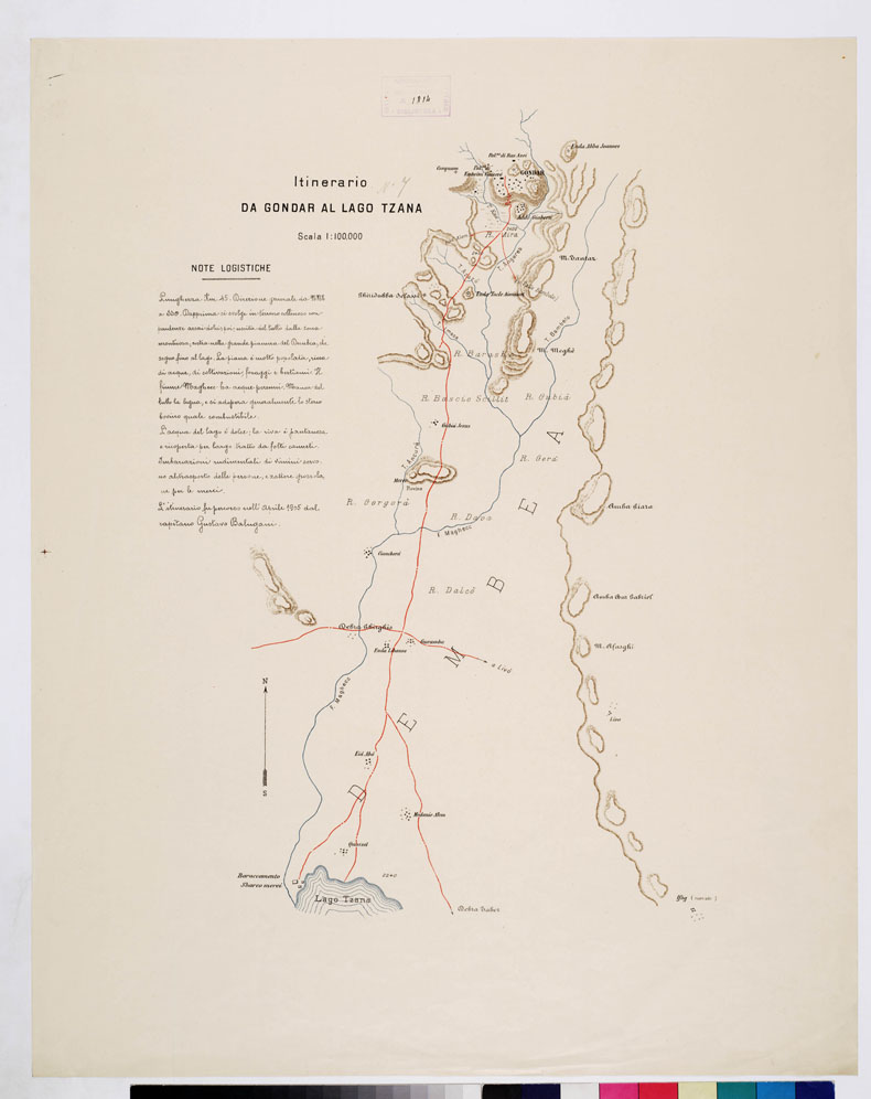 "I.G.M. ITINERARI OLTRE IL SETIT Sono 10 itinerari coi titoli rispettivi di: 1) El-Eghin-Nogara e Alcadrà- trivio Amba Mahar 2) Foce Sittona-Colle Chencher 3) Colle Chencher -Fiume Casà 4) Fiume Casà-Fiume Angareb 5)Fiume Angareb-Torrente Devez 6) Torrente Devez-Gondar 7) Gondar-Lago-Tzana 8) Tacazzé (Foce ittonia)-Culità-Adi Remoz e Culità-Belamba-Cafta 9) Adi Remoz-Adi Cocob-F.Casà-Torat-Mai Dembecà 10) Mai Dembecà-Bosa-Debarech-Encetcab-Darasghi. Stampa a colori con orografia rappresentata dimostrativamente in colore bistro, tracciato dell'itinerario in rosso, acque in azzurro, scritture in nero. In alcuni itinerari sono indicate le distanze calcolate in ore di marcia. Vi sono varie note logistiche. Vi è unito un quadro d'unione alla scala di 1:800.000. Gli itinerari furono rilevati dal Tenente Talamonti (1904) del R. Corpo di Truppe Coloniali e dalTenente Balugani del 4° Indigeni (1904-1905) e furono adoperati, insieme ai molti altri documenti del genere, per la compilazione della Carta dimostrativa della Colonia Eritrea e regioni adiacenti alla scala di 1:100.000. (ved. N° 41 d'ordine, N. 693 d'inventario generale)."