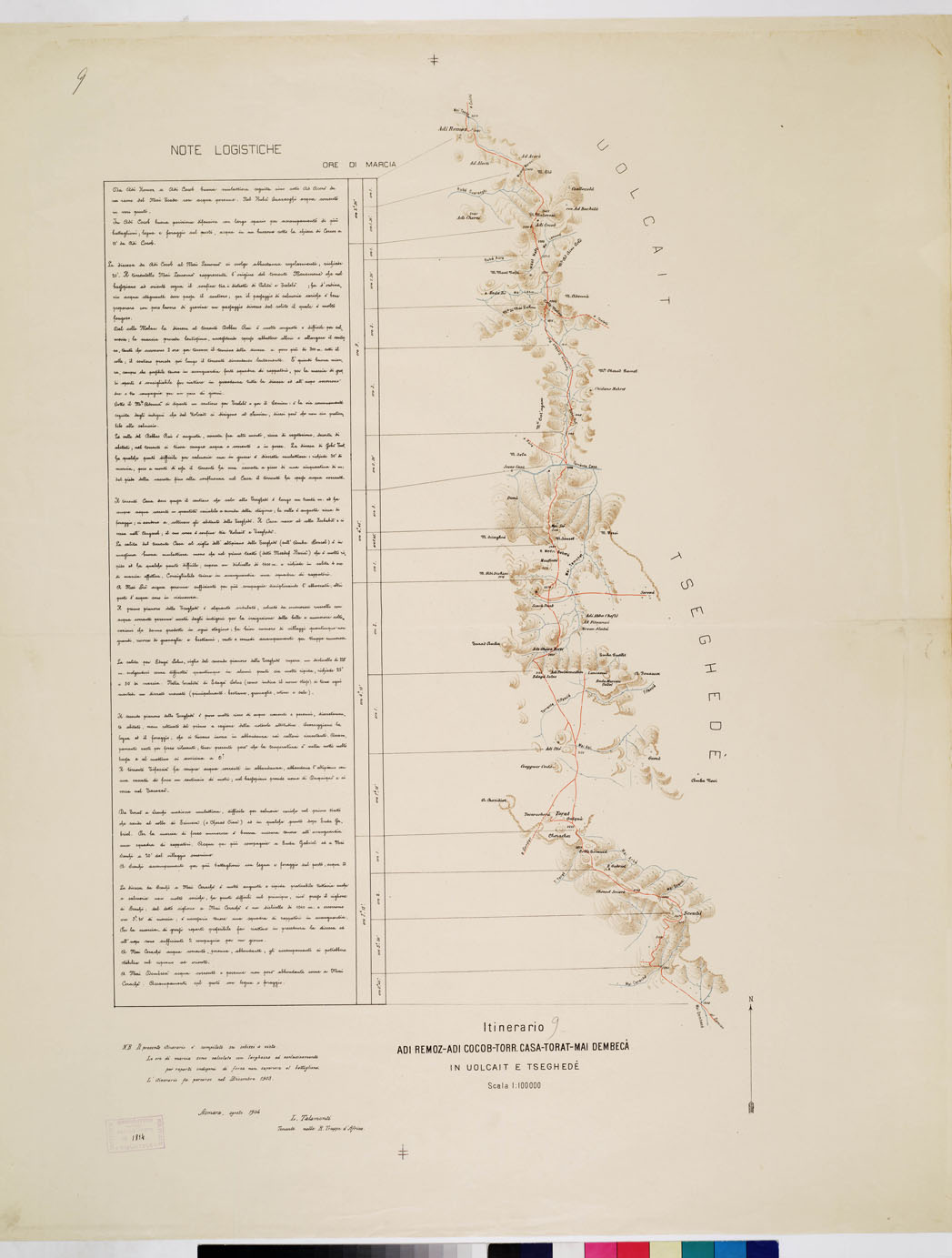 "I.G.M. ITINERARI OLTRE IL SETIT Sono 10 itinerari coi titoli rispettivi di: 1) El-Eghin-Nogara e Alcadrà- trivio Amba Mahar 2) Foce Sittona-Colle Chencher 3) Colle Chencher -Fiume Casà 4) Fiume Casà-Fiume Angareb 5)Fiume Angareb-Torrente Devez 6) Torrente Devez-Gondar 7) Gondar-Lago-Tzana 8) Tacazzé (Foce ittonia)-Culità-Adi Remoz e Culità-Belamba-Cafta 9) Adi Remoz-Adi Cocob-F.Casà-Torat-Mai Dembecà 10) Mai Dembecà-Bosa-Debarech-Encetcab-Darasghi. Stampa a colori con orografia rappresentata dimostrativamente in colore bistro, tracciato dell'itinerario in rosso, acque in azzurro, scritture in nero. In alcuni itinerari sono indicate le distanze calcolate in ore di marcia. Vi sono varie note logistiche. Vi è unito un quadro d'unione alla scala di 1:800.000. Gli itinerari furono rilevati dal Tenente Talamonti (1904) del R. Corpo di Truppe Coloniali e dalTenente Balugani del 4° Indigeni (1904-1905) e furono adoperati, insieme ai molti altri documenti del genere, per la compilazione della Carta dimostrativa della Colonia Eritrea e regioni adiacenti alla scala di 1:100.000. (ved. N° 41 d'ordine, N. 693 d'inventario generale)."