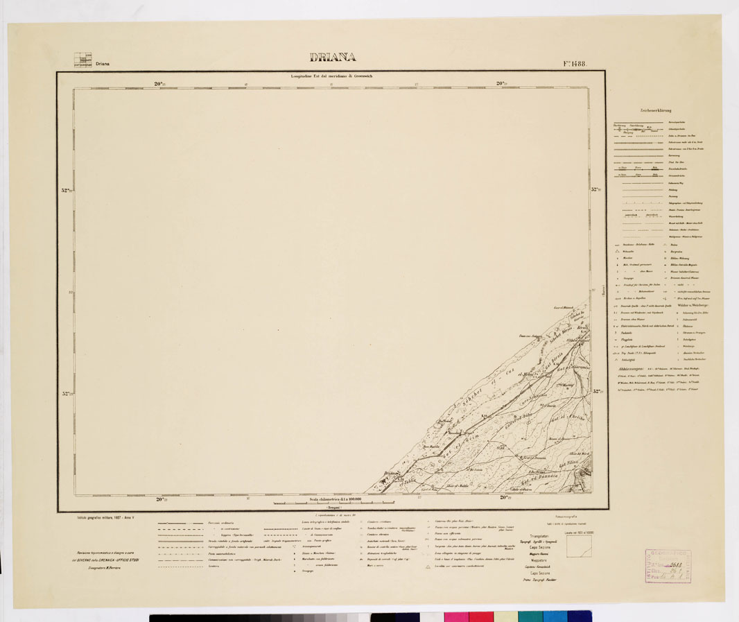 "I.G.M. COMANDO SUPERIORE F.F.A.A. REPARTO SPECIALE TOPOCARTOGRAFICO. Revisione Toponomastica e disegno a cura del Governo della Cirenaica Ufficio studi Disegnatore M. Ferrara. I fogli indicati col numero e nome o col solo numero senza altro segno, sono in corso di rilievo o programmati. Sul lato destro e sul lato inferiore di questa carta si trovano i Segni Convenzionali sia in italiano che in tedesco. Triangolatori Topografi Sgrilli e Spagnoli, Capo Sezione Magg. Gianni, Mappatore Cap. Copacipich, Capo Sezione Primo Topografo Fiechter."