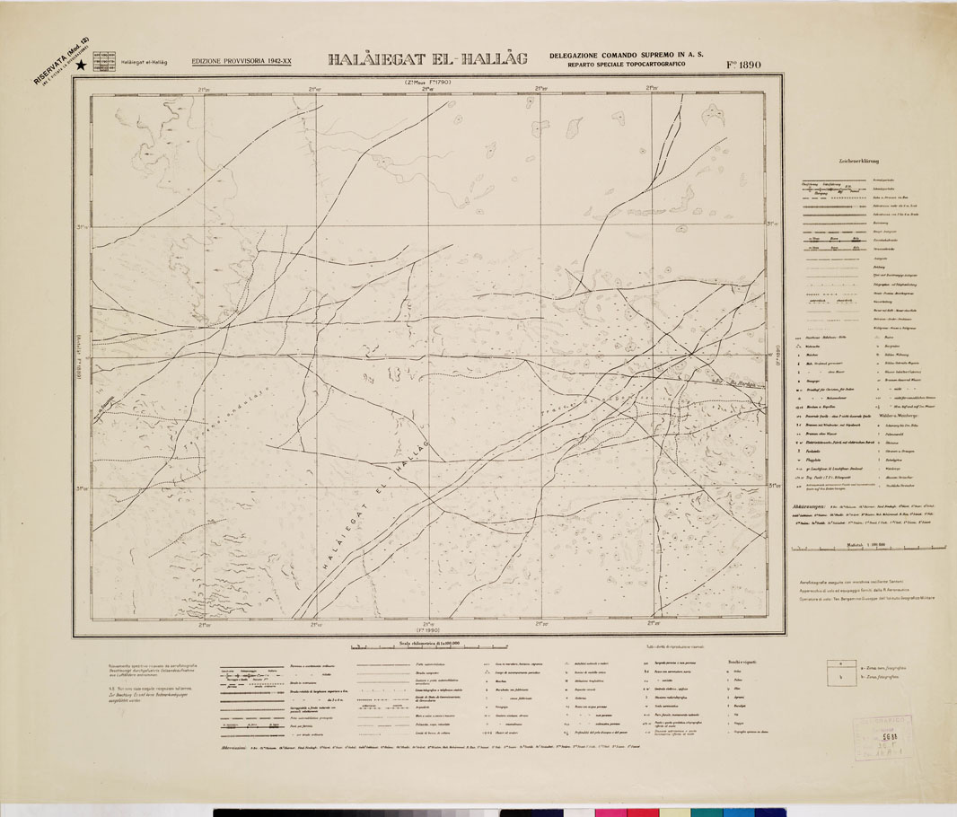 "I.G.M. COMANDO SUPERIORE F.F.A.A. REPARTO SPECIALE TOPOCARTOGRAFICO. Rilevamento speditivo ricavato da aereofotografie eseguite con macchina oscillante Santoni. Apparecchio di volo ed equipaggio forniti dalla R. Aeronautica operatore di volo Ten. Bergamino Giuseppe dell'I.G.M. I fogli indicati col numero e nome o col solo numero senza altro segno, sono in corso di rilievo o programmati. Sul lato destro e sul lato inferiore di questa carta si trovano i Segni Convenzionali sia in italiano che in tedesco."