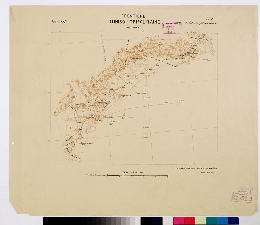 "(EDITION PROVISOIRE. REDUCTION PHOTOGRAPHIQUE DES LEVES AU 1:100.000). Sono otto fogli coi titoli rispettivi di: 1) El Mokta 2) Bir-Talarh 3) Mechehed-Salah 4) Dehibat 5) Zar 6) Mechiguig 7) Gara-Nolout 8) Ghadames. Orografia a curve tracciate alla equidistanza di 25 o 50 metri. Stampa in bistro con nomi in nero."
