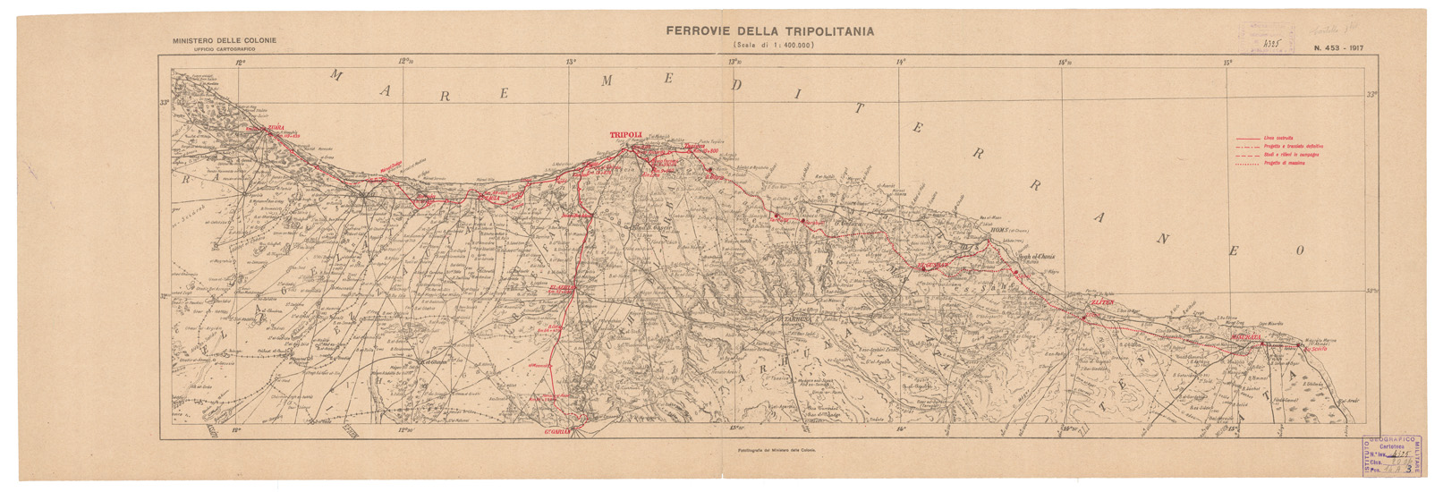 "Ministero delle Colonie. Ufficio Cartografico. Carta in foglio unico stampata in fotolitografia in nero con il tracciato della rete ferroviaria in rosso. Distingue le linee costruite, quelle in progetto (tracciato definitivo) e in progetto di massima indica anche gli studi e rilievi in campagna."