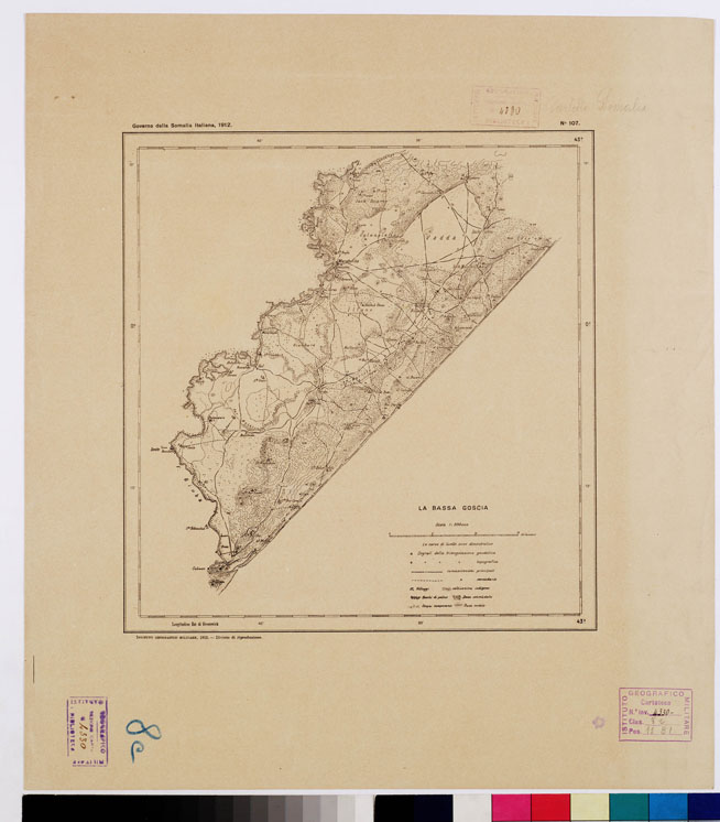 "Governo della Somalia Italiana. I.G.M. Un foglio stampato in nero. Mostra l'orografia a curve di livello dimostrative. Distingue villaggi, comunicazioni principali e secondarie, palmizi, coltivazioni indigene, stagni temporanei, dune consolidate e dune mobili. Indica inoltre i segnali della triangolazione geodetica e quelli della triangolazione topografica."