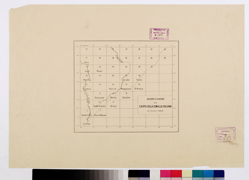 "Questa carta era destinata a rappresentare la zona compresa tra 0° 40' lat. sud e 5° 20' lat. nord e tra i meridiani 42° e 49° est Greenwich, in 40 fogli. La pubblicazione fu però, in seguito, sospesa. I fogli pubblicati (n° 1, 2, 3, 5, 6, 9, 10, 13, 14, 15, 19, 20) sono denominati rispettivamente: Giumbo, Gelib, Pozzi di Macasi, Passo di Comia, Brava, Merca, Danane, Barire, Mogadiscio, El Aracai, Scidle, Itala. Essi comprendano la parte costiera dalla foce del Giuba a Itala La rappresentazione è alquanto particolareggiata. Alla costruzione della carta parteciparono il Ministro degli Affari Esteri, l'I.G.M., e la Società Geografica Italiana. La compilazione è fondata su le determinazioni astronomiche e gli itinerari dei viaggiatori che percosero la regione e tutti gli schizzi, i rilievi speditivi, gli itinerari, ecc, raccolti a tutto il 1909. Proiezione scelta fu quella cilindrica equivalente Lambert i fogli costituiscano ognuno un trapezio di 40' di lat. per 1° di long. La stampa è a colori nero per le curve, le strade, gli itinerari, confini, dune, vegetazioni azzurro per le acque bistro per le curve, abbozzatee approssimative. Alla carta è unito un quadro d'unione."