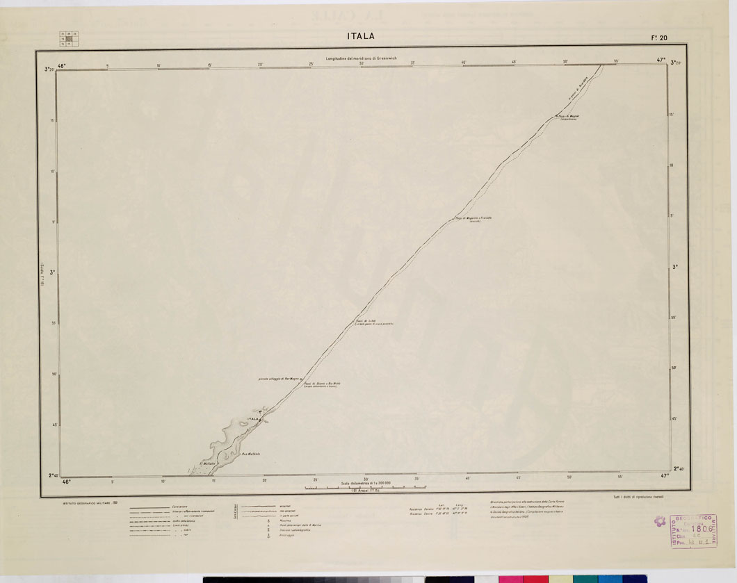 "Questa carta era destinata a rappresentare la zona compresa tra 0° 40' lat. sud e 5° 20' lat. nord e tra i meridiani 42° e 49° est Greenwich, in 40 fogli. La pubblicazione fu però, in seguito, sospesa. I fogli pubblicati (n° 1, 2, 3, 5, 6, 9, 10, 13, 14, 15, 19, 20) sono denominati rispettivamente: Giumbo, Gelib, Pozzi di Macasi, Passo di Comia, Brava, Merca, Danane, Barire, Mogadiscio, El Aracai a Itala. Essi comprendano la parte costiera dalla foce del Giuba a Itala la rappresentazione è alquanto particolareggiata. Alla costruzione della carta parteciparono il Ministero degli Affari Esteri, l'I.G.M., e la Società Geografica Italiana. La compilazione è fondata su le determinazioni astronomiche e i rilievi idrografici della R. Marina Italiana, le determinzioni astronomiche e gli itinerari, ecc, raccolti a tutto il 1909. Proiezione scelta fu quella cilindrica equivalente Lambert i fogli costituiscano ognuno un trapezio di 40' di lat. per 1° di long. La stampa è a colori nero per le curve, le strade, gli itinerari, confini, dune, vegetazioni azzurro per le acque bistro per le curve, abbozzate e approssimative. Alla carta è unito un quadro d'unione."