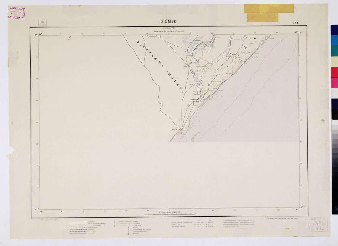 "Questa carta era destinata a rappresentare la zona compresa tra 0° 40' lat. sud e 5° 20' lat. nord e tra i meridiani 42° e 49° est Greenwich, in 40 fogli. La pubblicazione fu però in seguito, sospesa. I fogli pubblicati (n° 1, 2, 3, 5, 6, 9,10, 13, 14, 15, 19, 20) sono denominati rispettivamente: Giumbo, Gelib, Pozzi di Macasi, Passo di Comia, Brava, Merca, Danane, Barire, Mogadiscio, El Aracai, Scidle, Itala. Essi comprendano la parte costiera dalla foce del Giuba a Itala la rappresentazione è alquanto particolareggiata. Alla costruzione della carta parteciparono il Ministero degli Affari Esteri, l'I.G.M., e la Società Geografica Italiana. La compilazione è fondata su le determinazioni astronomiche e i rilievi idrografici della R. Marina Italiana, le determinzioni astronomiche e gli itinerari dei viaggiatori che percorsero la regione e tutti gli schizzi, i rilievi speditivi, gli itinerari, confini, dune, vegetazioni azzurro per le acque bistro per le curve, abbozzate e approssimative. Alla carta è unito un quadro d'unione."