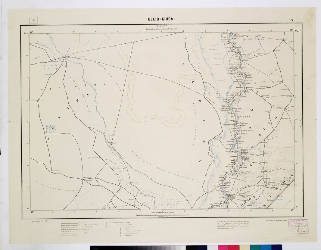 "Questa carta era destinata a rappresentare la zona compresa tra 0° 40' lat. sud e 5° 20' lat. nord e tra i meridiani 42° e 49° est Greenwich, in 40 fogli. La pubblicazione fu però, in seguito, sospesa. I fogli pubblicati (n° 1, 2, 3, 5, 6, 9, 10, 13, 14, 15, 19, 20) sono denominati rispettivamente: Giumbo, Gelib, Pozzi di Macasi, Passo di Comia, Brava, Merca, Danane, Barire, Mogadiscio, El Aracai, Scidle, Itala. Essi comprendano la parte costiera dalla foce delo Giuba a Itala la rappresentazione è alquanto particolareggiata. Alla costruzione della carta parteciparono il Ministero degli Affari Esteri, l'I.G.M., e la Società Geografica Italiana. La compilazione è fondata su le determinzioni astronomiche e i rilievi idrografici della R. Marina Italiana, le determinazioni astronomiche e gli itinerari dei viaggiatori che percorsero la regione e tutti gli schizzi, i rilievi speditivi, gli itinerari, confini, dune, vegetazioni azzurro per le acque bistro per le curve, abbozzate e approssimative. Alla carta è unito un quadro d'unione."