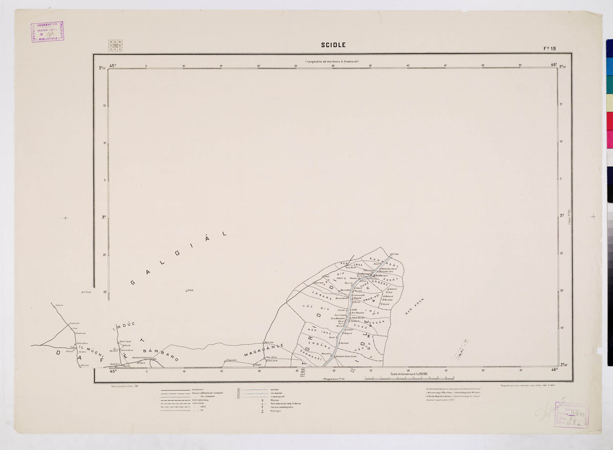 "Questa carta era destinata a rappresentare la zona compresa tra 0° 40' lat. sud e 5° 20' lat. nord. tra i meridiani 42° e 49° est Greenwich, in 40 fogli. La pubblicazione fu però, in seguito, sospesa. I fogli pubblicati (n° 1, 2, 3, 5, 6, 9, 10, 13, 14, 15, 19, 20) sono denominati rispettivamente: Giumbo, Gelib, Pozzi di Macasi, Passo di Comia, Brava, Merca, Danane, Barire, Mogadiscio, El Aracai, Scidle, Itala. Essi comprendano la parte costiera dalla foce del Giuba a Itala la rappresentazione è alquanto particolareggiata. Alla costruzione della carta parteciparono il Ministero degli Affari Esteri, l'I.G.M., e la Società Geografica Italiana. La compilazione è fondata su le determinazioni astronomiche e i rilievi idrografici della R. Marina Italiana, le determinazioni astronomiche e gli itinerari dei viaggiatori che percorsero la regione e tutti gli schizzi, i rilievi speditivi, gli itinerari, ecc, raccolti a tutto il 1909. Proiezione scelta fu quella cilindrica equivalente Lambert i fogli costituiscano ognuno un trapezio di 40' di lat. per 1° di long. La stampa è a colori nero per le curve, le strade, gli itinerari, confini, dune, vegetazioni azzurro per le acque bistro per le curve, abbozzate e approssimative. Alla carta è unito un quadro d'unione."