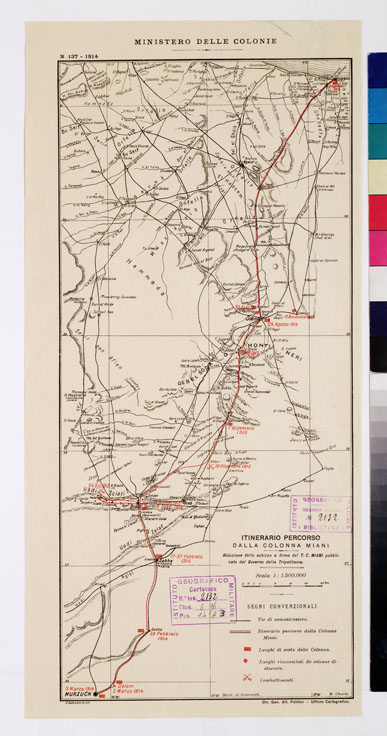 "Riproduzione dello schizzo a firma del T. C. Miani pubblicato dal Governo della Tripolitania. Ministero delle Colonie. Direzione Generale Affari Politici. Ufficio Cartografico. C. Salussolia lit. Cartina compilata da M. Checchi. Mostra le vie di comunicazione in nero, e l'itinerario Miani in rosso con indicazione dei luoghi di sosta della colonna, luoghi riconosciuti da colonne distaccate, luoghi di combattimento. "